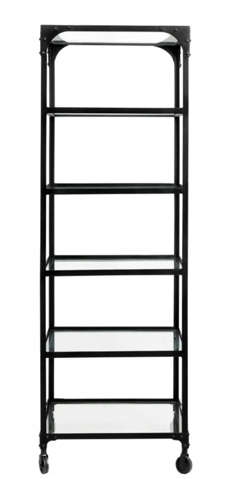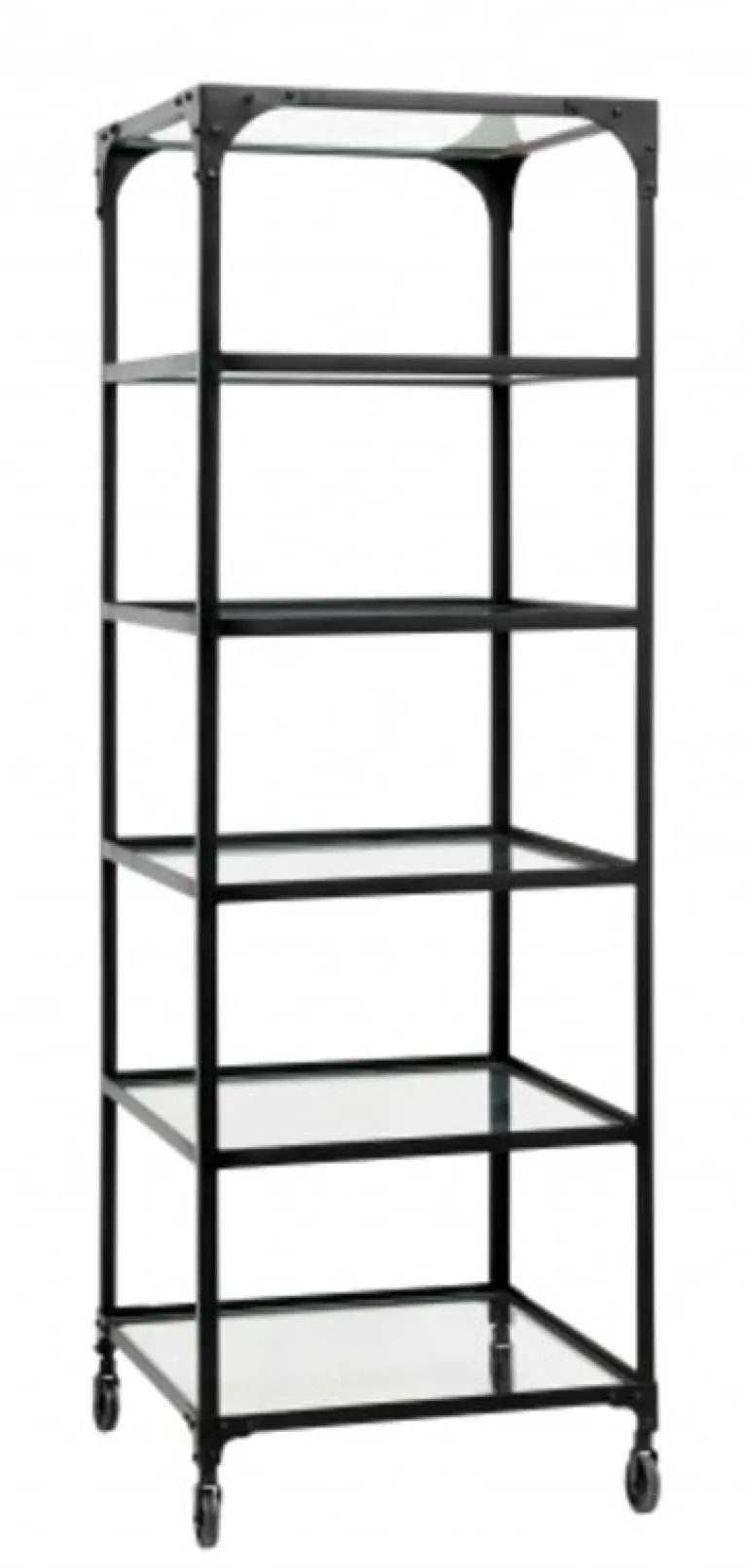 Functioneel ijzeren rek van Nordal. Handig detail is dat de kast wielen heeft! Het ijzeren rek heeft glazen planken. Afmeting 62x62x183cm