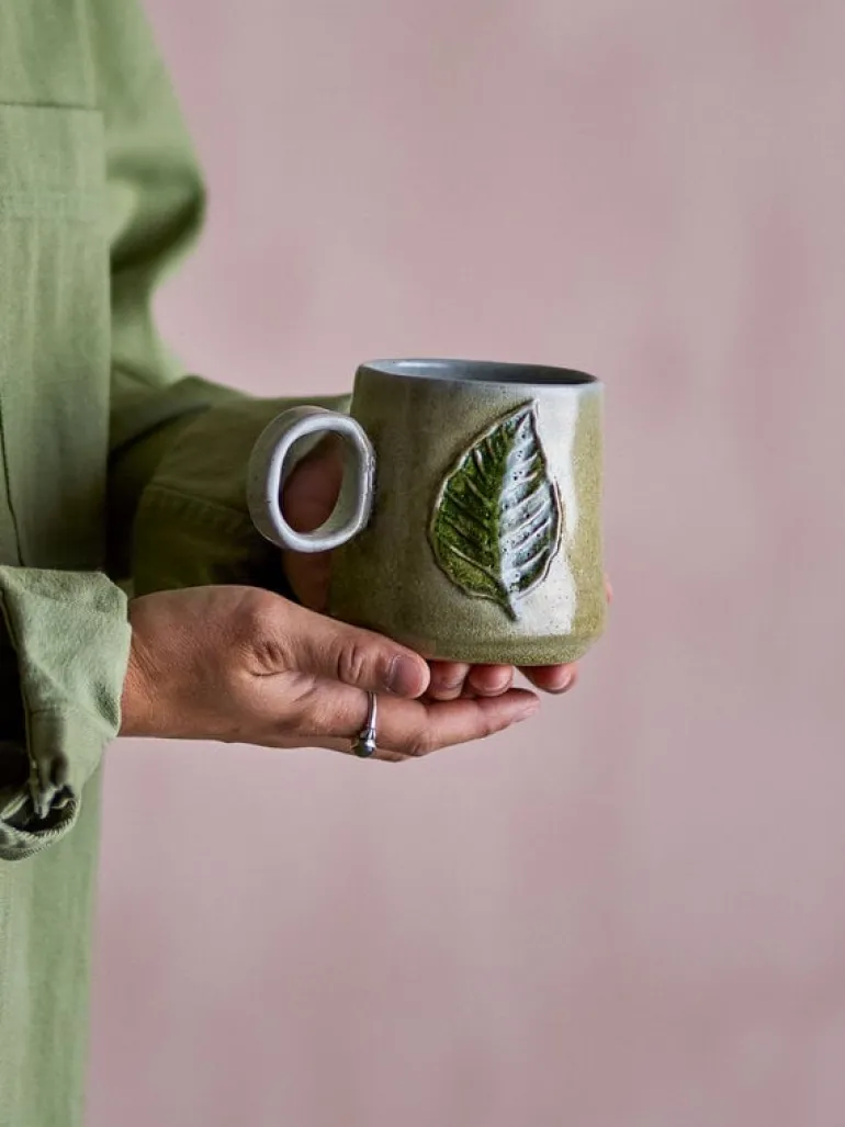 De Bloomingville Jasper mokken worden geleverd in een set van 6 stuks. De mok is versierd met bladpatronen, wat de rustieke uitstraling benadrukt. Afmeting Ø9,5x10cm