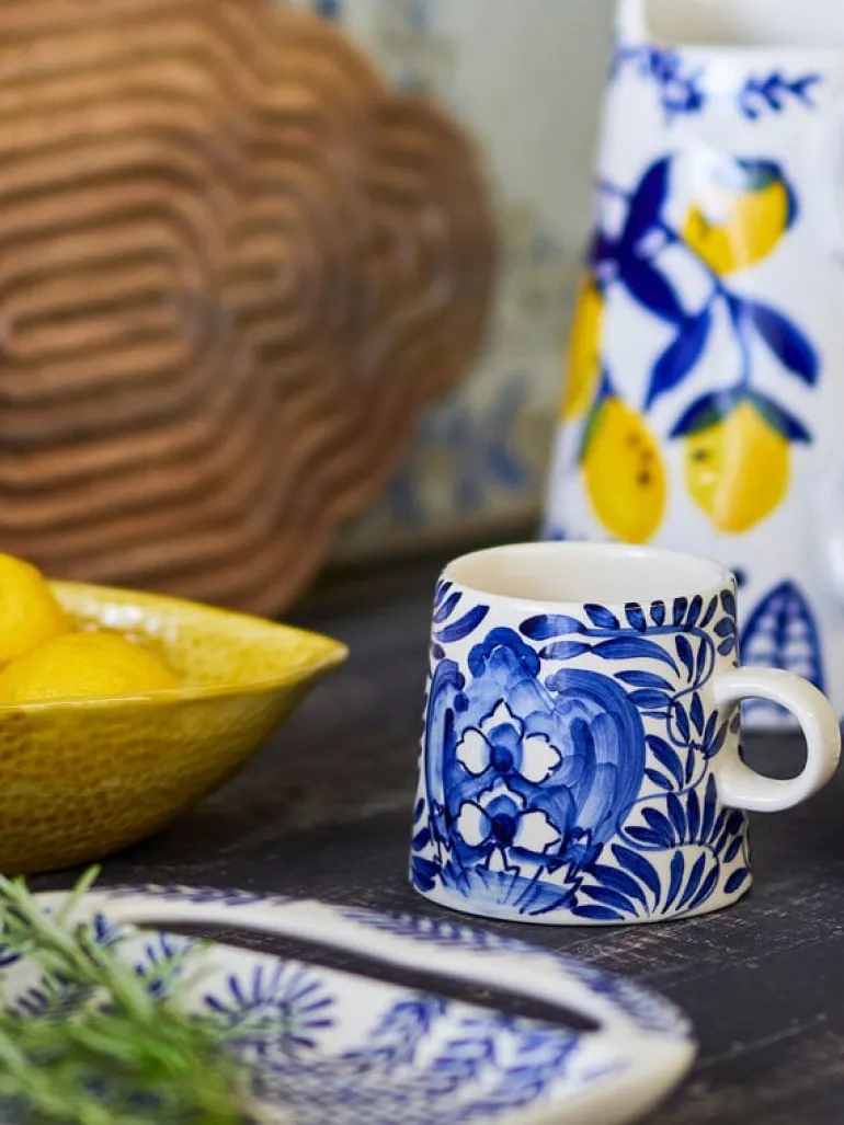 De Bloomingville Karlie mokken zijn geïnspireerd op de sfeer van de Middellandse Zee. Gemaakt van aardewerk met blauwe details. Wordt geleverd in een set van 6 stuks. Afmeting Ø10x9cm