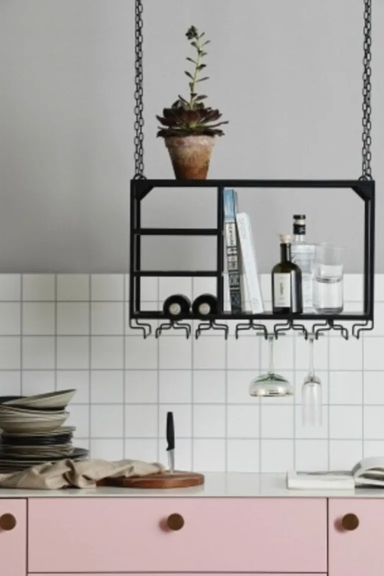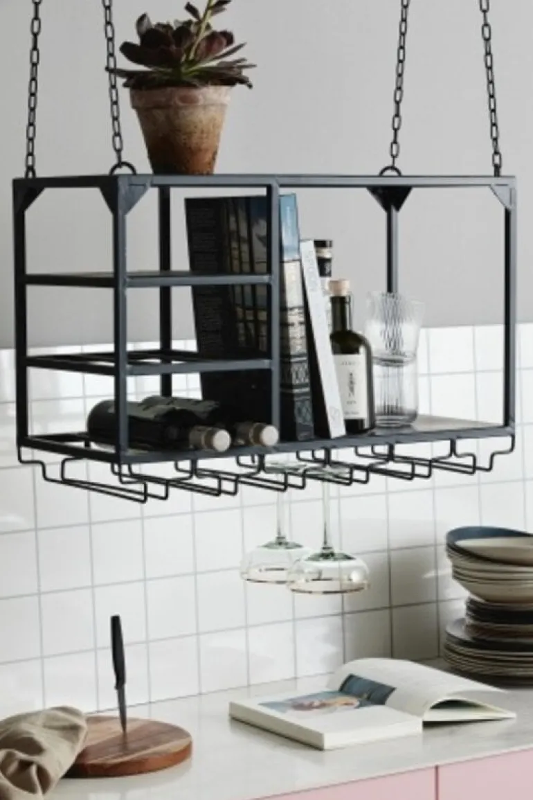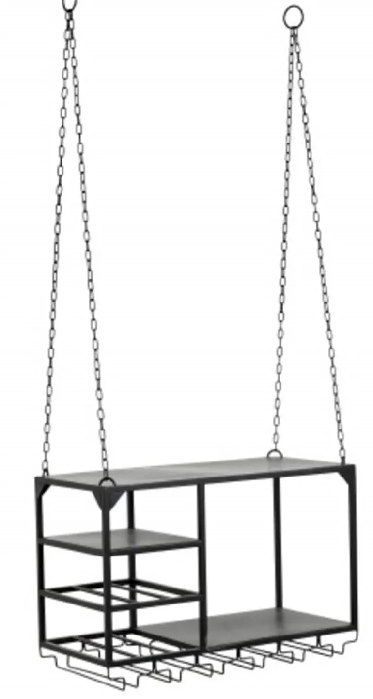 Handig rek voor in de keuken van Nordal. Dit loft rek is op te hangen aan de meegeleverde metalen kettingen. Ideaal voor het opbergen van wijnglazen en flessen. Ook beschikbaar in een grotere maat. Afmeting 65x30x37cm