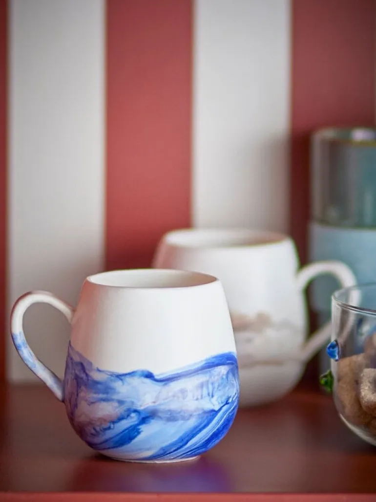 De Bloomingville Lyre Cmokken worden geleverd in een set van vier stuks. Gemaakt van aardewerk met een aquarelachtig effect in blauwtinten. Afmeting Ø8x8cm