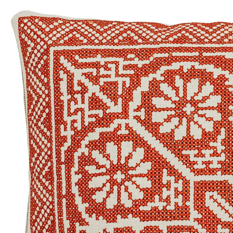Het Bloomingville Madita kussen heeft een traditioneel patroon in warme rode en natuurlijke witte kleuren. Het kussen is ontworpen met symmetrische patronen en gedetailleerde bloemmotieven. Afmeting 40x40cm