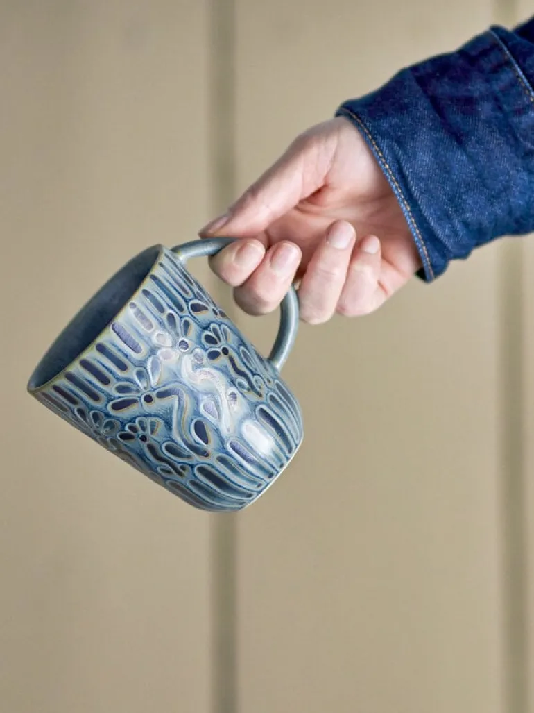 De Bloomingville Samsin mokken zijn versierd met een reliëfpatroon in contrasterende lichtere tinten. Wordt geleverd in een set van 6 stuks. Afmeting Ø8x10cm