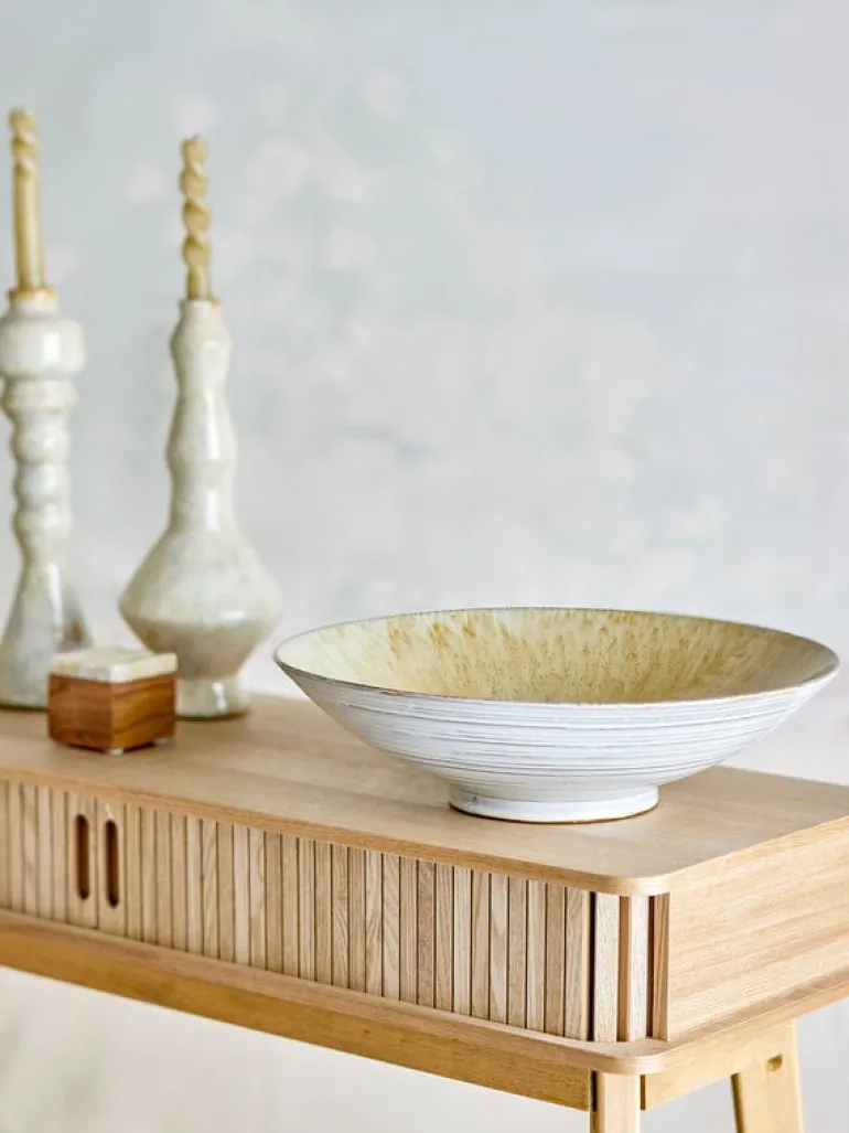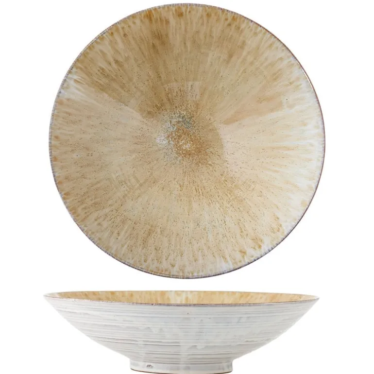 De Bloomingville Saskia schaal is gemaakt van aardewerk in goudtinten. De grote schaal is ideaal voor het serveren van fruit, kleine gerechten of als decoratief middelpunt op tafel. Afmeting Ø40x11cm
